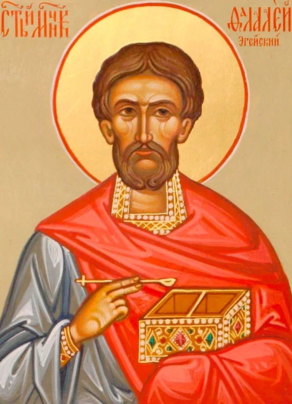 У часі царювання Нумеріана (283 – 284) правитель міста Егєї розіслав воїнів розшукувати християн. До нього привели Фалалея, 18-річного білявого юнака. На розпитування правителя святий Фалалей відповідав: “Я християнин, родом з Лівану (Сирія). Батько мій, на ім’я Берук, був воєначальником, а матір звуть Ромілією. У мене є брат у сані іподиякона. Я ж навчений лікарській справі лікарем Макарієм. Під час гоніння на християн у Лівані я був приведений до правителя Тиверія, але ледве уникнув страти. Тепер стою перед судом, роби зі мною, що хочеш. Бажаю померти за Христа Спасителя і Бога мого, сподіваючись з Його допомогою перетерпіти всі муки”.