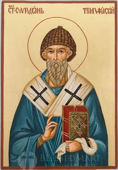 Святий Спиридон жив на острові Кіпр у селі Аскія наприкінці ІІІ століття. Будучи простим пастухом і людиною малоосвіченою, він мав Божественний дар безкорисливої любові до ближнього, лагідності вдачі, чуйності, милосердя, гостинності та інших чеснот. Подібно до патріарха Авраама, Спиридон з радістю приймав у своїй оселі кожного, хто приходив до його дверей, надаючи гостю таку шану, ніби зустрічав Самого Христа. Не було жебрака чи убогого, який не звертався б до нього по допомогу і не був би втішений. Всі свої гроші Спиридон складав у скриньку, що тримав відкритою для всіх нужденних, ніколи не дбаючи про те, повна вона чи порожня, гідні чи недостойні допомоги ті, хто опускав туди руку. Дружина Спиридона народила благовірному чоловікові дочку Ірину і померла. Святий, після смерті дружини, повністю присвятив себе досягненню нетлінних Небесних дарів.